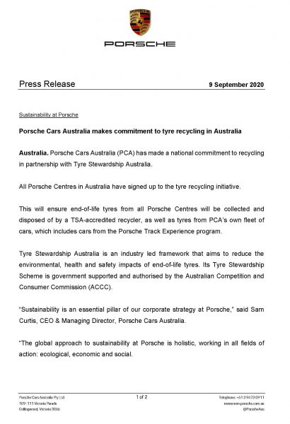 Porsche dealers have shown support for the responsible disposal of used tyres by signing up with Tyre Stewardship Australia (TSA) and becoming the newest Member of the Tyre Product Stewardship Scheme. This environmental pledge by Porsche is testament to their approach towards end-of-life tyres in Australia.